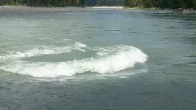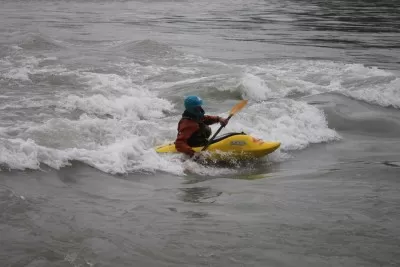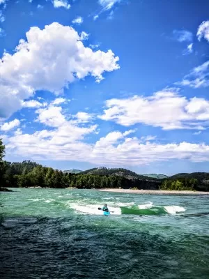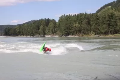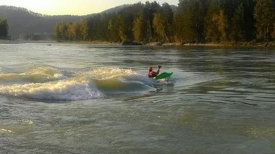 Спот работает по низкому уровню воды, не более чем 360 см [Чемал]. По мере спадания уровня сначала появляется небольшой валик с шапкой, на котором легко серфить. Очень хорош для обучения серфингу. По мере дальнейшего спадания уровня, начинает преобразовываться в бочку, которая становится все более и более держащей, но в любом случае, при отстреле промывает человека и лодку.