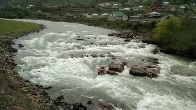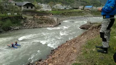 Река падает через большие каменные ступени. По центру остров. Левая протока может быть проходима в большую воду. Основная протока справа, серия сливов высотой до метра с бочками, шириной во всю протоку. После выходной бочки струя наваливает на большие камни в центре русла.