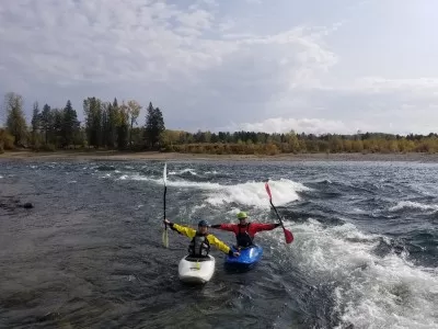 Сужение русла в скальном коридоре. По определенному уровню воды работает волна для серфинга.